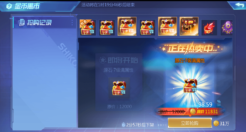 2、每个商品上架后,在购买时限内均可购买,购买所需要的金币将随着商品上架时长逐渐降低