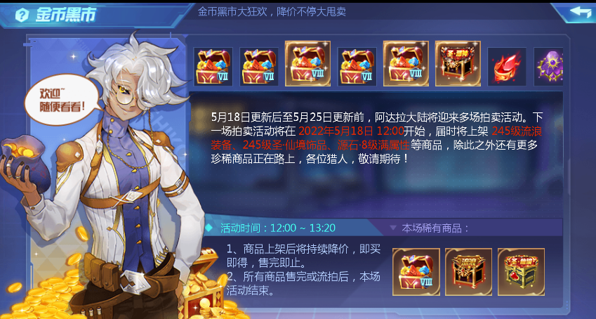 四、金币黑市抢好礼!黑市商人带着新一批珍稀物品来到阿达拉大陆,245级流浪装备、245级圣·仙境饰品、幽冥之息、源石·8级满属性、源能组件、不朽宝石碎片等豪华奖励邀你抢购!