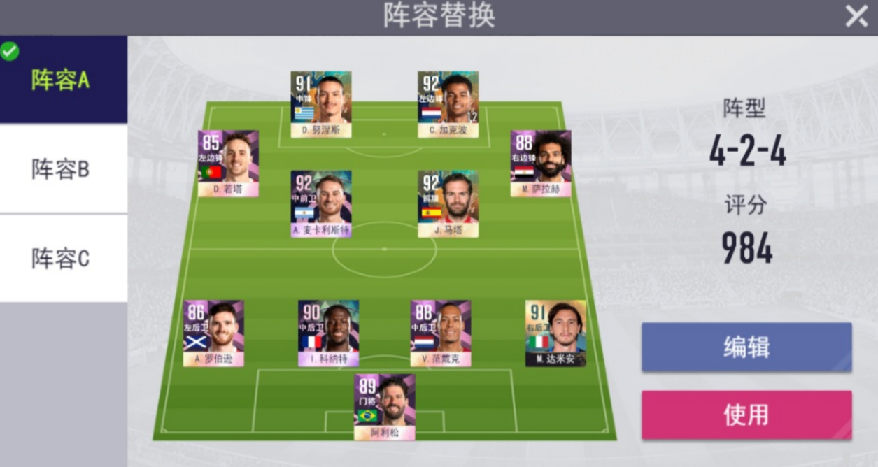 阵容信息显示的玩家当前阵容的上场球员以及阵型球员以球员卡的形式显示,调整阵容有3个功能:阵型切换、自动调整和职责任命
