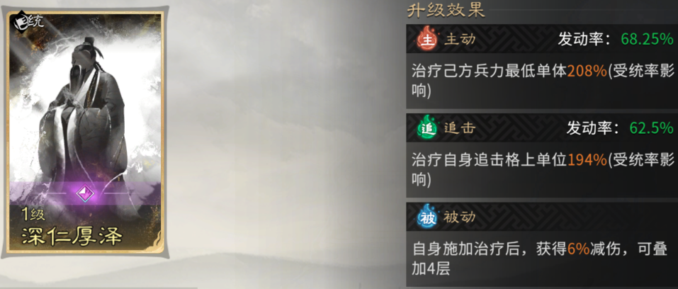 高顺:主动技能与追击技能都固定携带【深仁厚泽】,为我方兵力最低单位提供回复。被动技能固定携带【首尾相援】,受到伤害后为我方全体回复兵力。