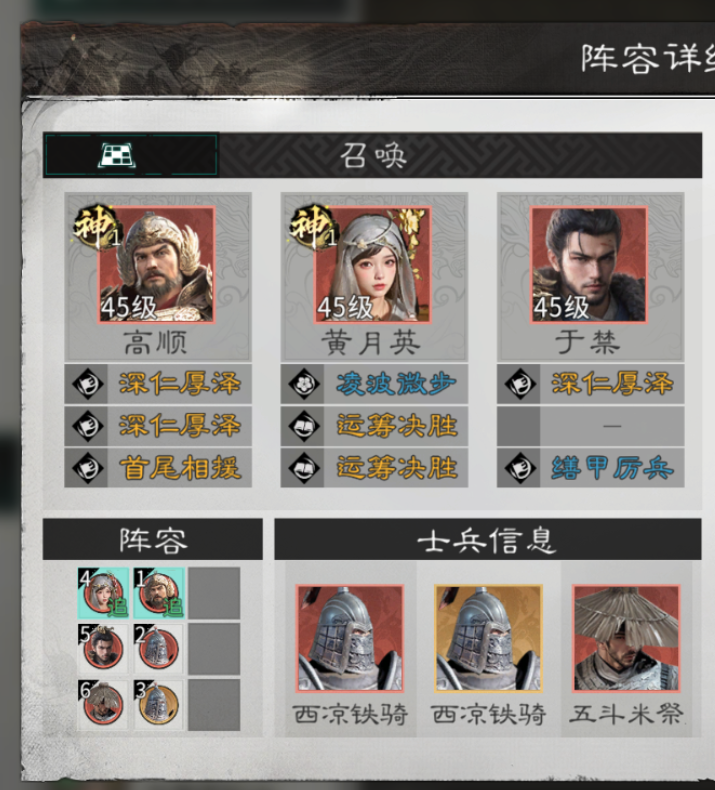 兵种站位:于禁下方放置一名五斗米祭,并在于禁和五斗米祭的前方各放置一名西凉铁骑。
