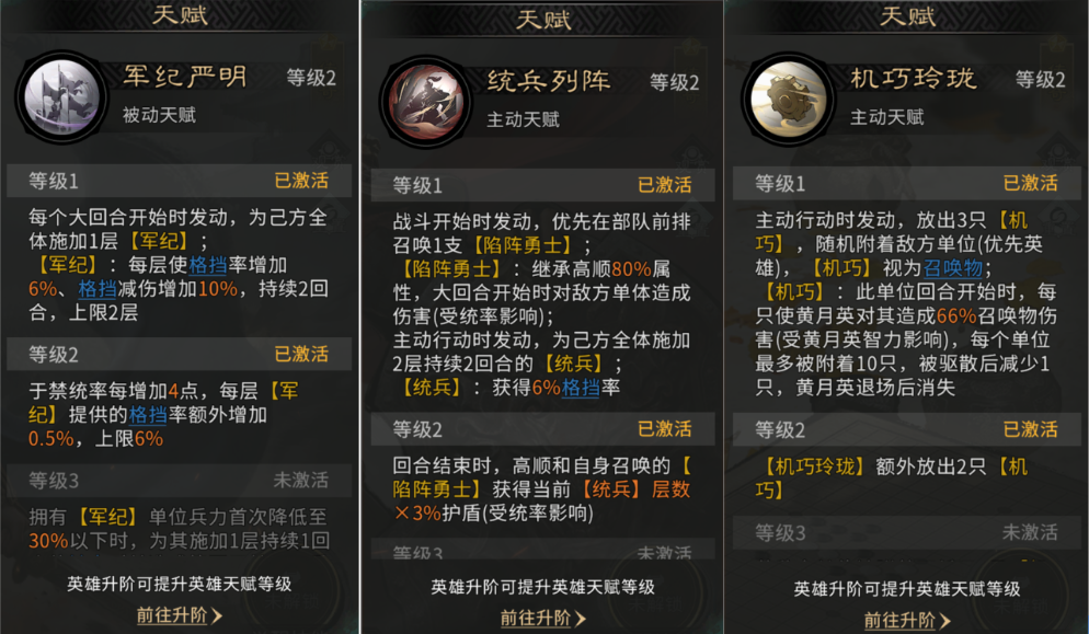 高顺发动天赋【统兵列阵】,为我方全体施加统兵(增加格挡率),进一步提高我方全体承伤能力,觉醒技能【陷阵之志】再为我方全体施加额外统兵层数,并有概率令己方召唤物立即行动一次,可以和黄月英觉醒技能【木牛流马】互相配合。