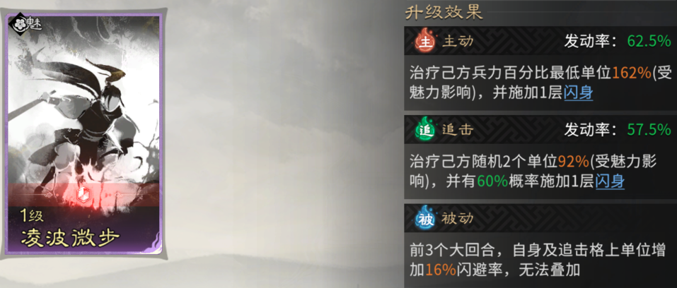 黄月英:主动技能固定携带【凌波微步】,为我方兵力百分比最低单位提供回复并施加一层闪身(必定闪避1次直接伤害,每触发1次减少1层)。追击技能与被动技能都固定携带【运筹决胜】作为黄月英的第二输出点并提供伤害加成。