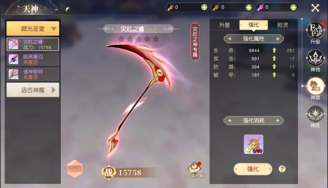 强化:针对已激活的神器,可通过消耗神器强化精华进行强化,不同品质的神器只能消耗对应品质的强化精华。强化精华可通过分解对应品质的神器获得。