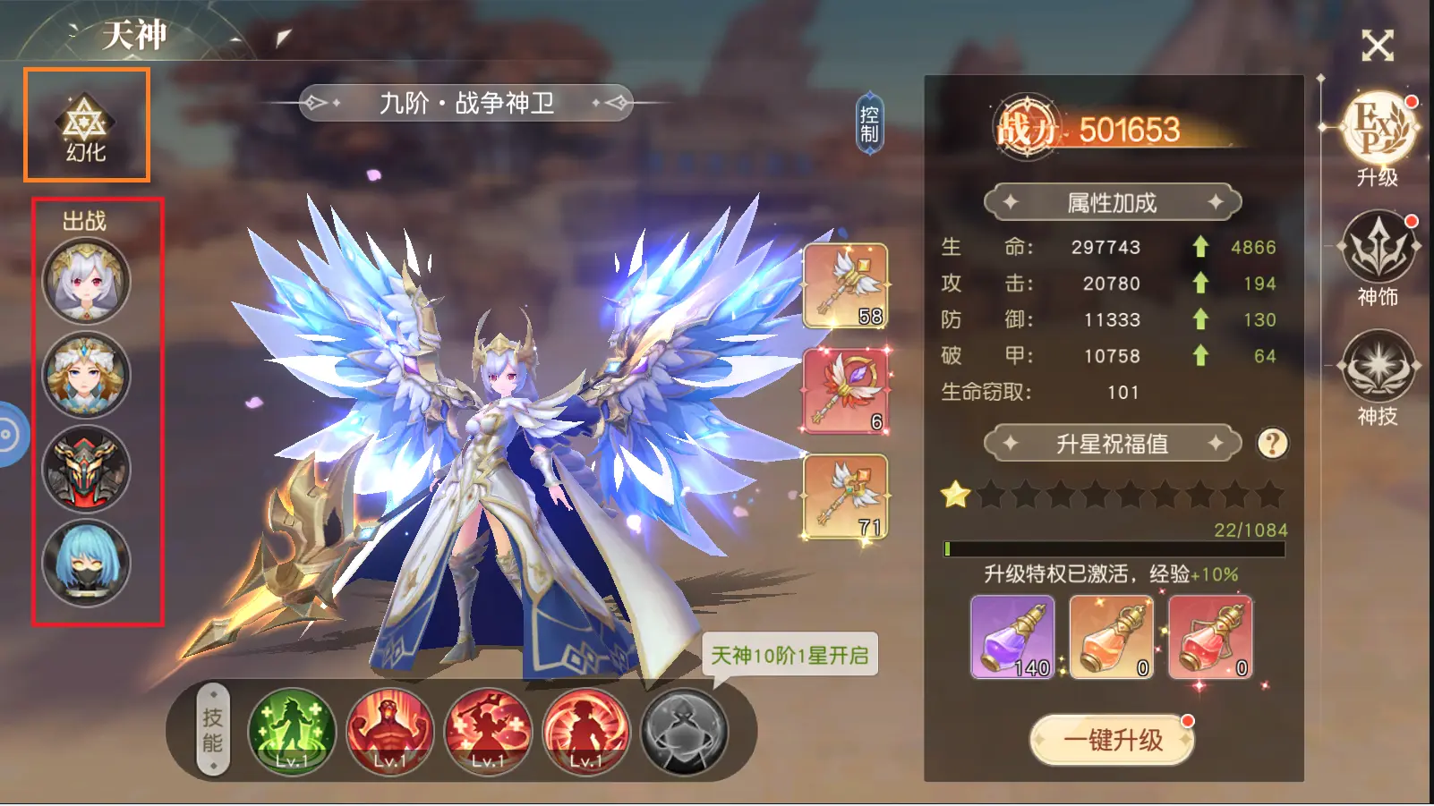 而升星界面可以看到上图,需要消耗天神的碎片。碎片或通过天神之门副本、或通过运营活动、也可以通过魔王获得。获得后的使用情况如下: