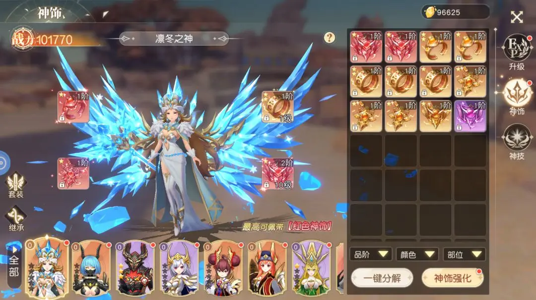 神饰:通过为天神佩戴神饰以增加天神属性,神饰可以通过消耗星辉精华强化,星辉精华可以通过分解神饰、商城获得。
