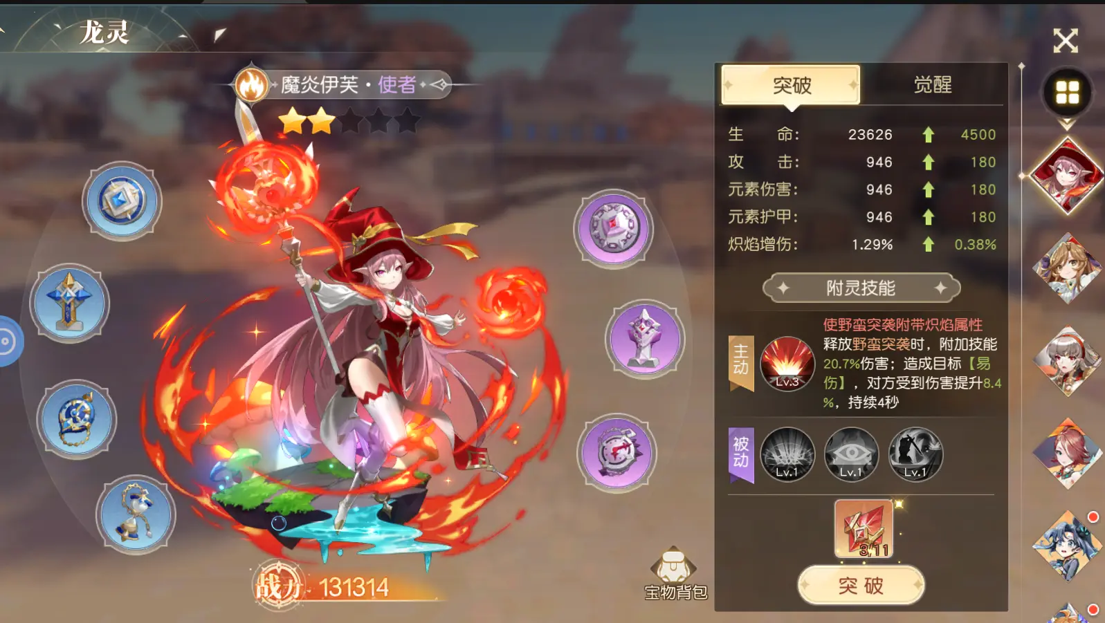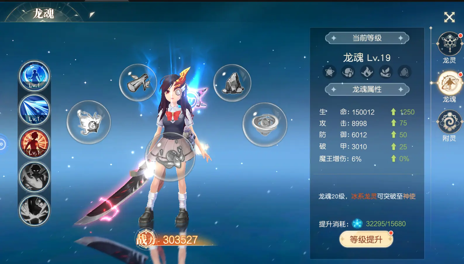 如图所示,龙灵突破需要消耗对应属性的启灵石,启灵石可以通过绑钻商店、星月战场和王者之塔获得。突破后该龙灵会获得属性加成,并且会解锁新的被动。另外,龙灵的突破上限是根据玩家的龙魂等级来定的