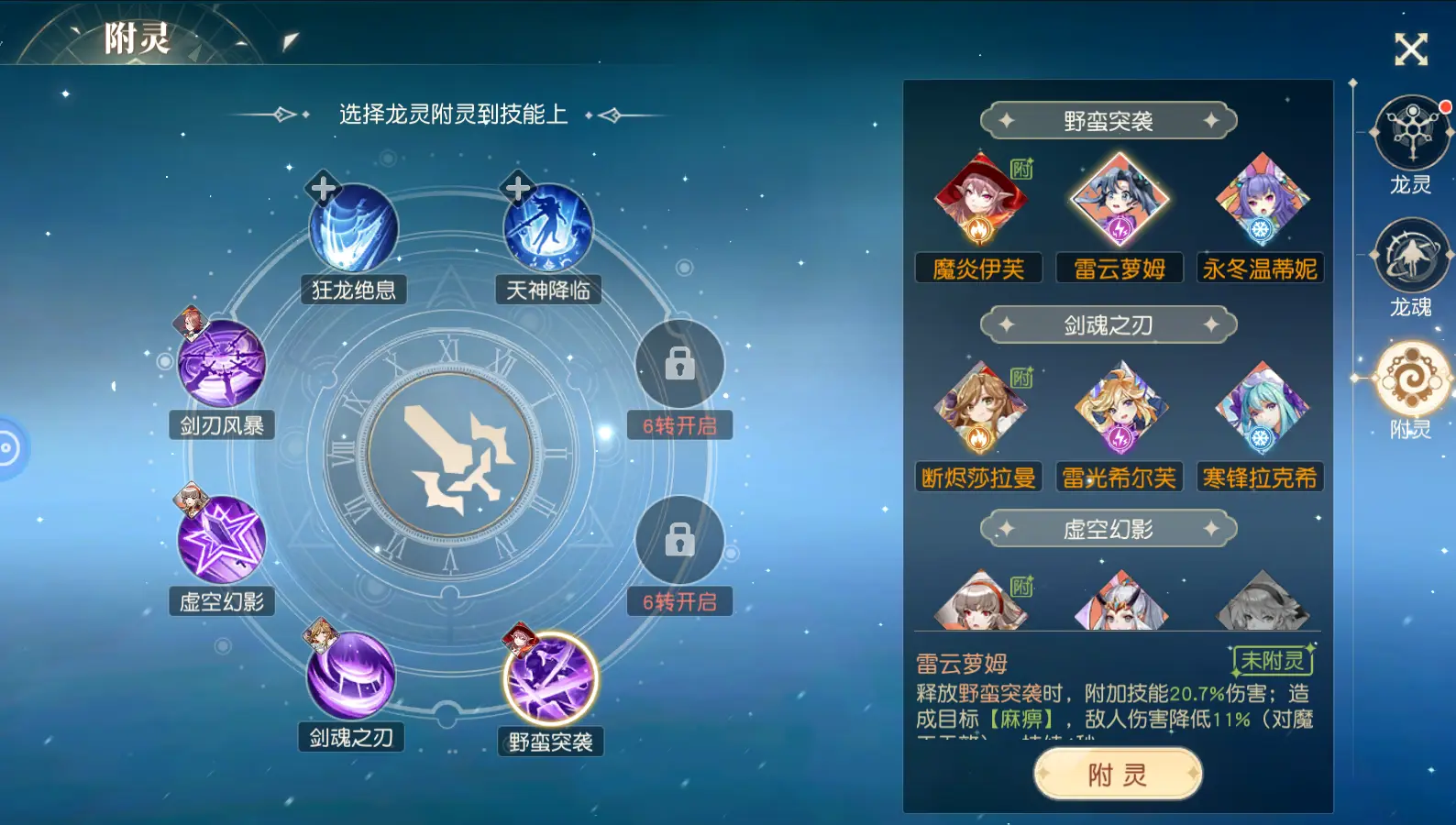 附灵:将解锁的龙灵附灵到技能上,可以增加技能效果,如【易伤】等,大幅提升。只有已激活的龙灵才能进行附灵操作,龙灵激活后,附灵界面显示该龙灵可进行附灵,此时点击左边描述底部的附灵按钮,即可将该龙灵进行附灵。最好附灵同属性的龙灵到不同技能上,这样能打出一定的配合combo。