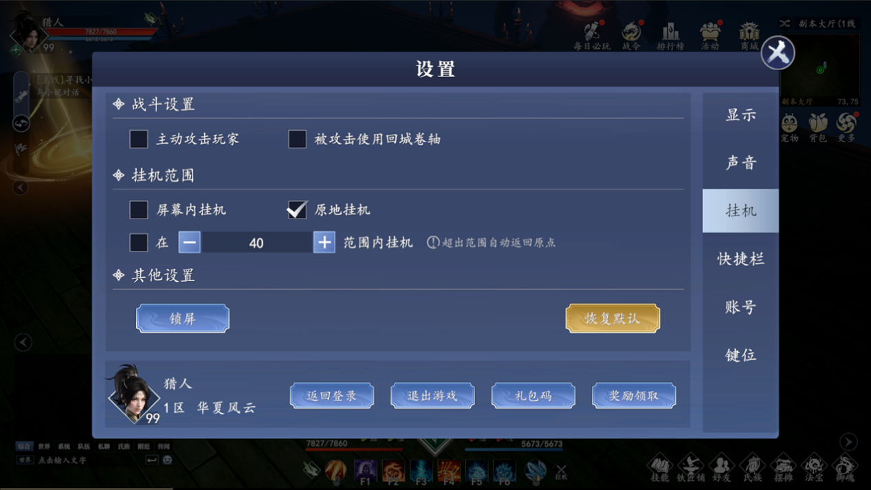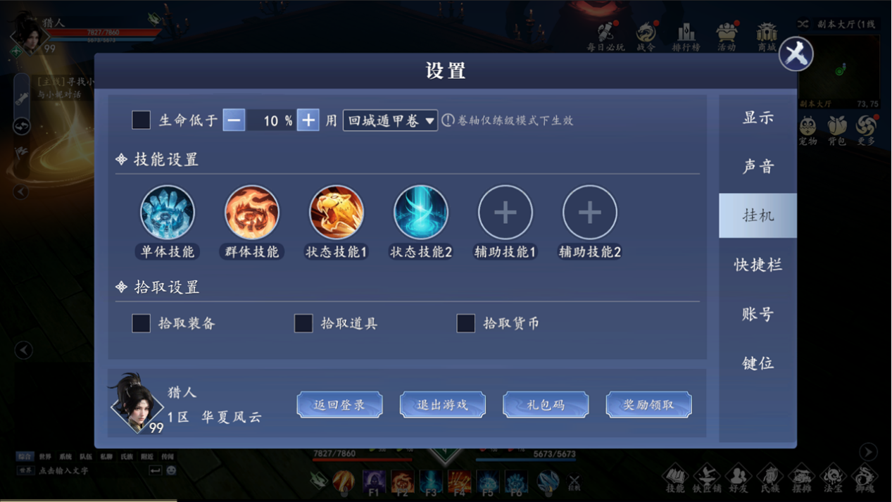 • 经验副本进去挂机的话,提前把2个挂机技能全换成群伤和范围伤害;记得在挂机中设置群体攻击和定点挂机,不然人物会到处跑。