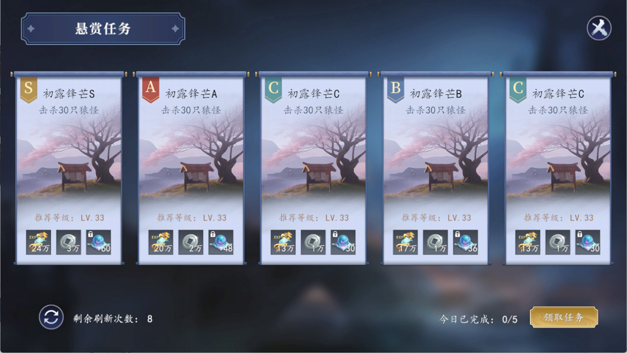 ,尽量刷出S级的任务,经验多奖励好,可以一次接完5次。