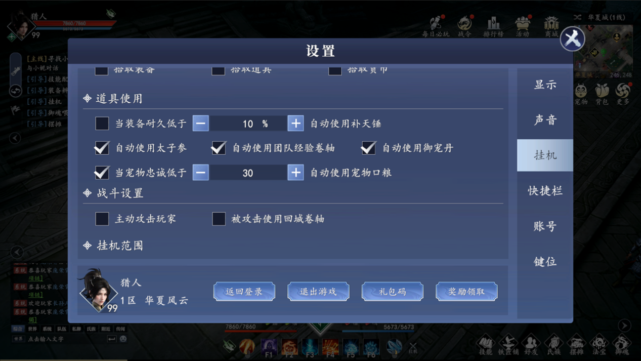 记得在挂机设置中勾选太子参、团双、御宠丹,在线奖励可每日领取,也可在商城购买。(有时候就差那么一点升级)