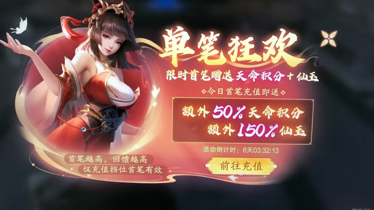 活动期间限时首笔充值赠送逍遥币+仙玉,首笔充值越高,回馈越高,仅限充值档位首笔有效