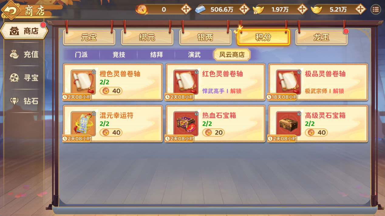 风云商店内可兑换灵兽卷轴,幸运符,热血宝箱等奖励哦,红色灵兽卷轴非常稀有,各位少侠不要错过了哦!