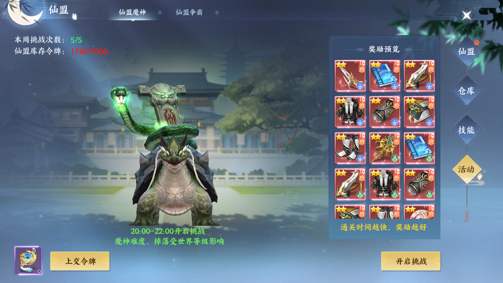 挑战晚上8点到10点开启!每个仙盟每周又五次挑战机会,只有盟主和副盟主才有开启机会!玩法开启需要【神魔令牌】需要仙盟盟友捐献,捐献者可以获得仙盟贡献!