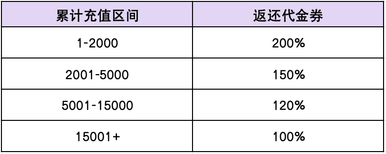 如您在测试期间累计充值20000元,在游戏公测后可一次性领取的代金券为: