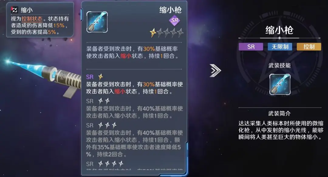 携带缩小枪通过技能二的嘲讽效果吸引火力为己方角色提供输出空间,同时缩小效果使目标输出能力降低,受到伤害增加,还能降低敌方速度;