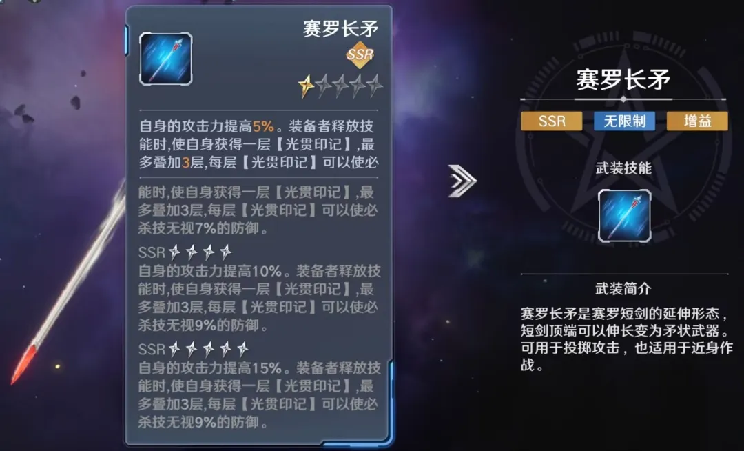 携带赛罗长矛通过提升攻击力增加勇气屏障提供的护盾,加强己方全体受到群体攻击的生存能力;