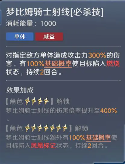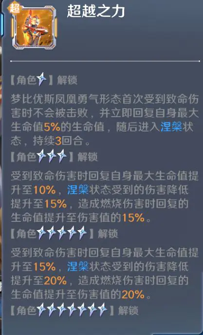 优点免疫致命伤害使自身生存得到提升;涅槃使梦比优斯凤凰受到伤害降低,同时己方全体造成燃烧的伤害值回复自身生命。