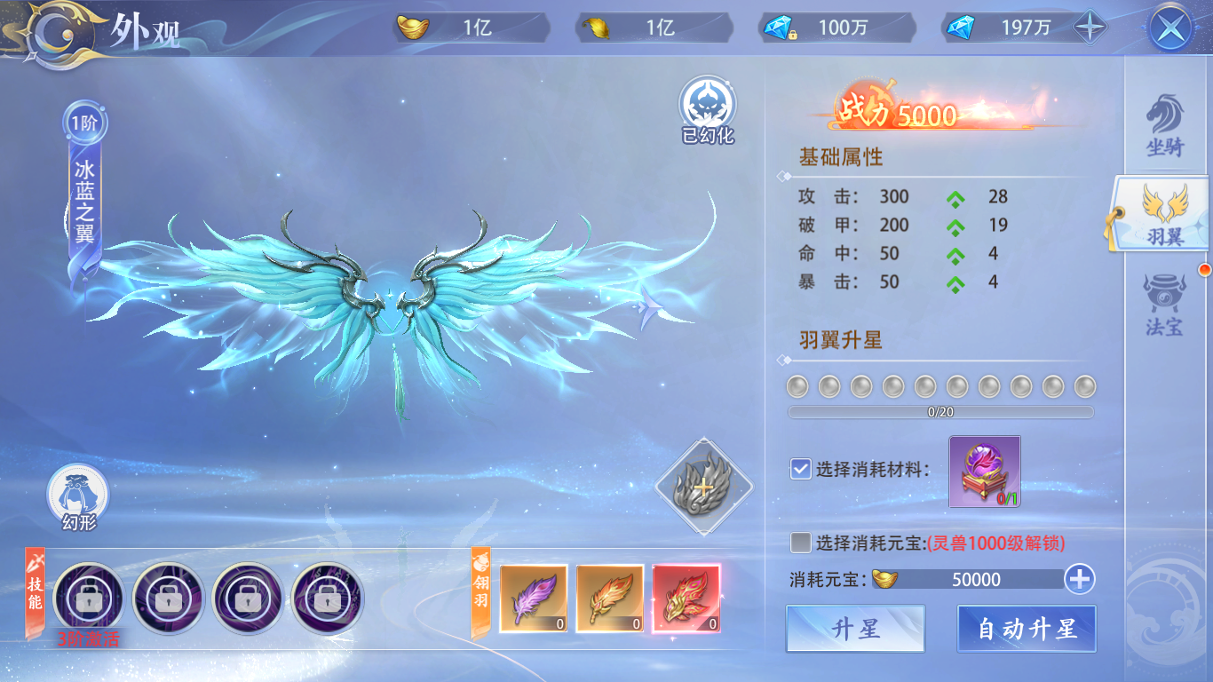 羽翼:达到开启等级,完成对应等级的主线任务后即可开启羽翼系统。