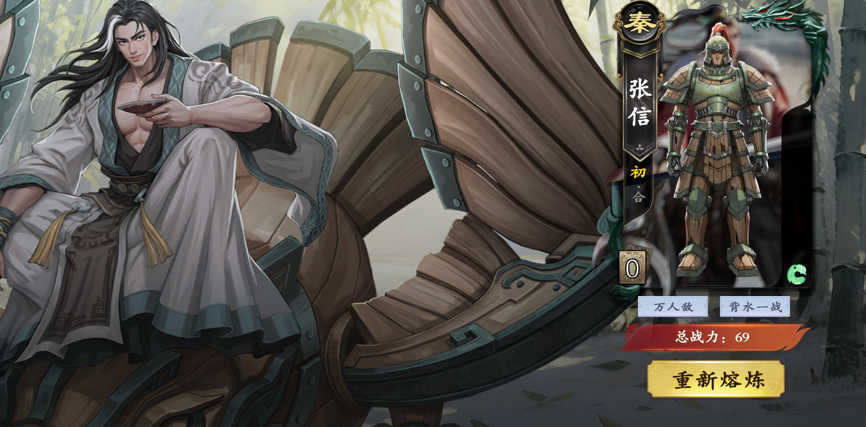 在武将-熔炼武将(右上角),可以选择2名武将技能,将其熔炼为1名武将。韩信选择背水一战,可以将所有牌作为杀打出;张飞选择万人敌,开局不要被抢闪,接下来一直出杀即可。
