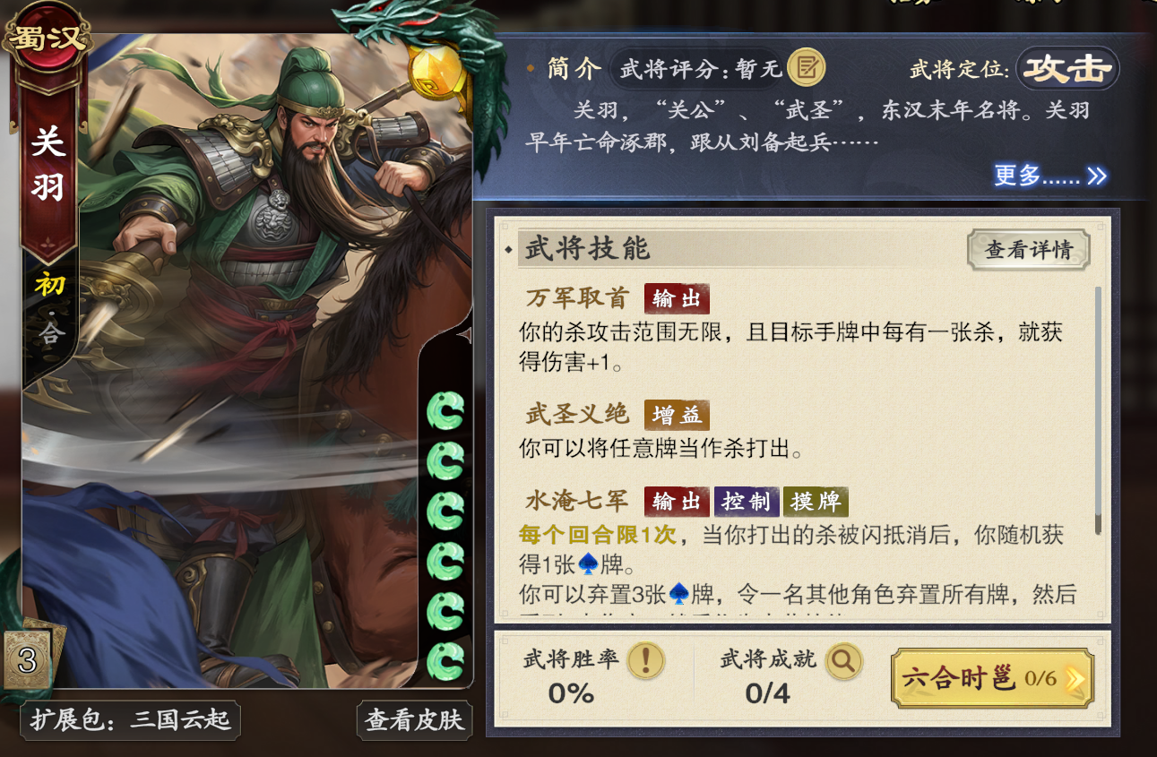 关羽:关羽“万军取首”很好用,出杀时目标手牌没有1张杀可伤害+1,特别适合打等级较高的赵高,一波可以打出高额伤害。