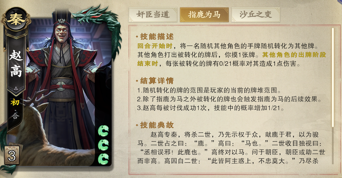 指鹿为马是控场类技能,可将其他角色牌转化为其他牌。如果我们打出被转化的牌,赵高会摸牌,一般都建议弃牌(赵高如果没手牌,就比较好打,主要看打法);其他有“转化能力”的武将会被赵高克制,这个模式尽量不要玩小乔、张良、吕布。