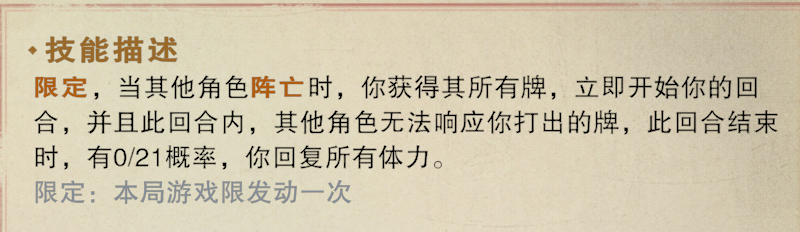 沙丘之变在其他角色阵亡时会触发,可以过牌,并且让其他角色无法响应自己的牌。尽量不要出现阵亡,如果被刀掉一个,赵高可能会开始收割、乱杀。我们讨伐次数越多,这个技能触发后,就会有更高的概率给赵高回复所有体力(不能死,死了基本打不过)。