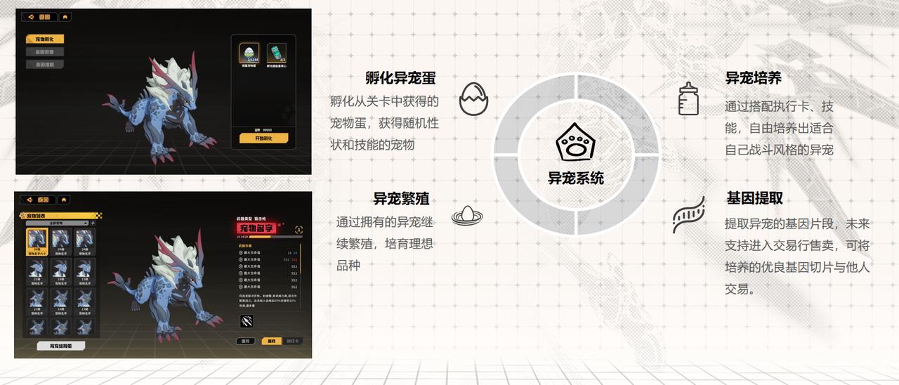 - 养成体验丰富:目前异宠养成玩法包括孵化(从关卡获异宠蛋和胚胎培养电池孵化)、繁殖(用诱导软体和胚胎培养电池)、提取(从异宠身上提取基因),诱导软体交易及宠物成品交易系统将在后续版本开启。