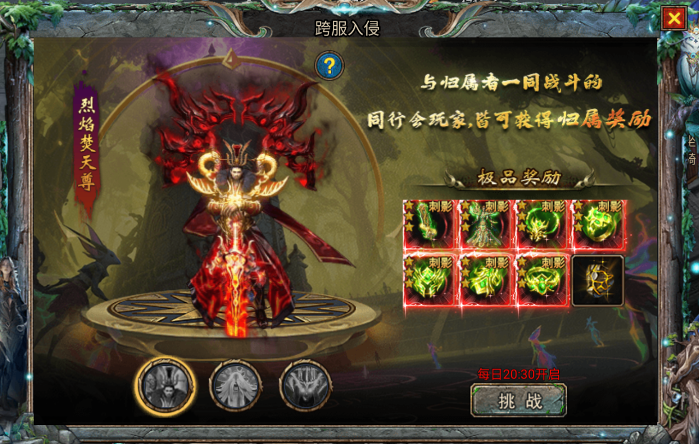 跨服入侵活动在开服第二天每天 20:30 开启,每人每次只允许进入一张地图,击杀归属者可抢夺怪物归属。参与该活动时,要提前了解地图情况,与队友密切配合,制定抢夺归属和防守的策略,争取获得传奇武器、装备强化石等丰厚奖励。
