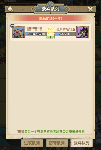 2、战斗:点击进攻队列就能向非己方冒险者发起挑战,也能攻击矿场守卫。