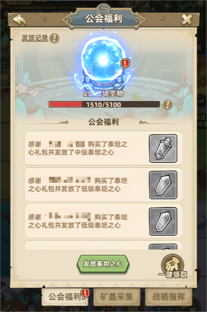 2、地心能量球作为回复能量的重要道具,适当积攒以备后手绝对没错;此外通过领取公会福利中的泰坦之心升级战场圣物(泰坦之心将在活动结束后清空,记得及时使用),公会全员都将获得能量球,记得喊上小伙伴一起及时领取。