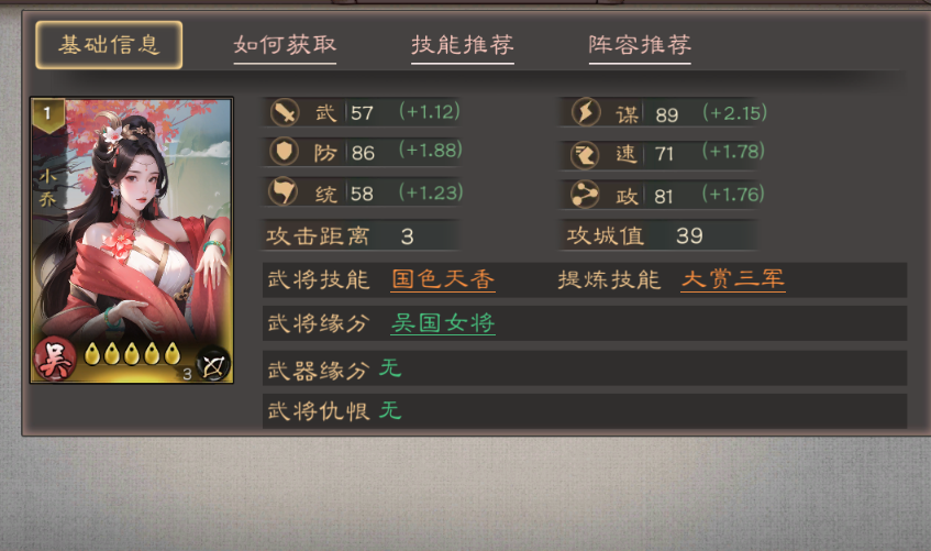 她的自带技能“国色天香”能为我军群体提供稳定的持续回血,搭配输出核心时可大幅提升队伍续航能力,同时适配“吴国女将”缘分体系。