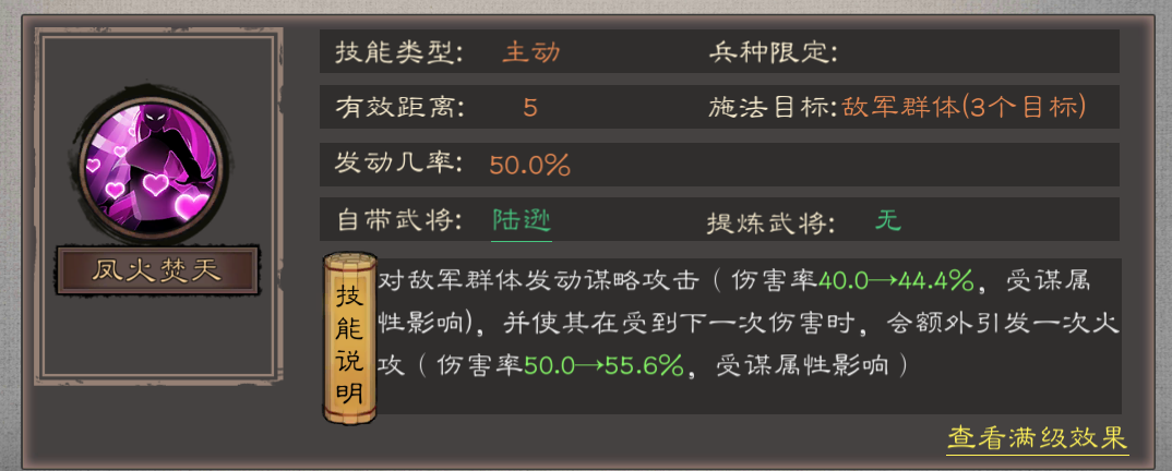 类型:主动技能,定位是“群体谋略输出+联动火攻”,梯度为T0级谋略输出技能。
