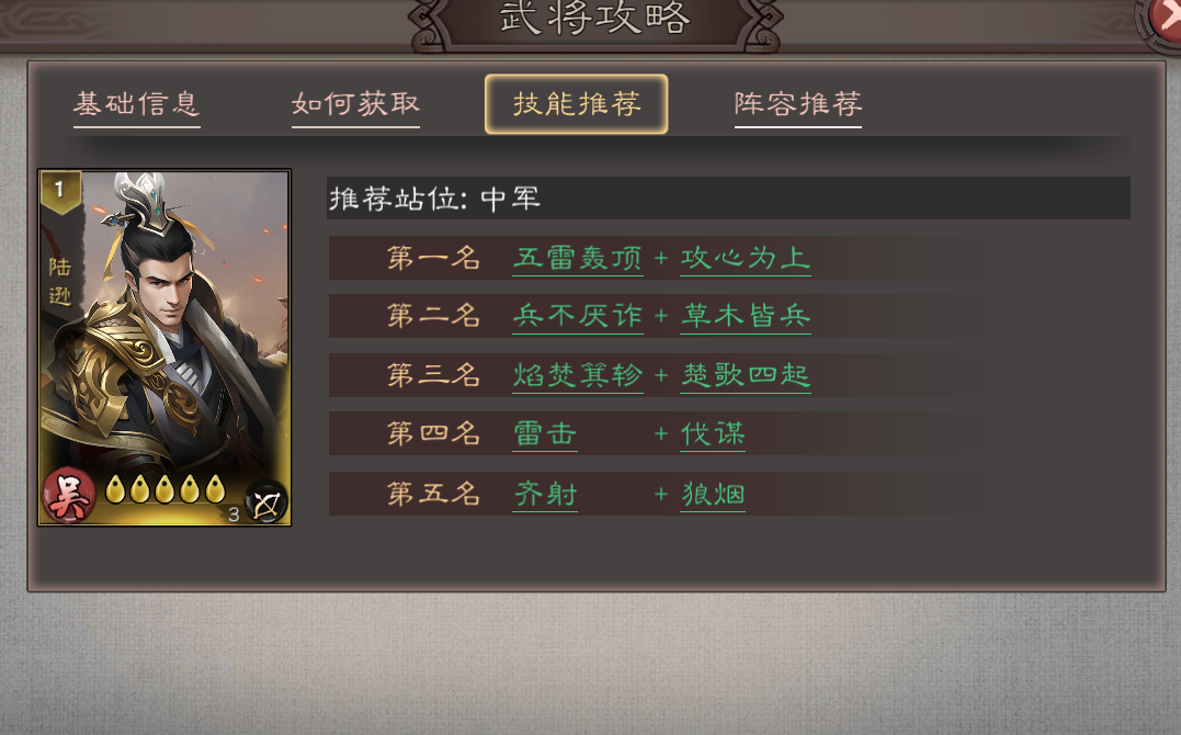 陆逊是吴阵营谋略输出型武将,定位为“群体谋略输出+联动增伤”,梯度属于T0级吴阵营核心。