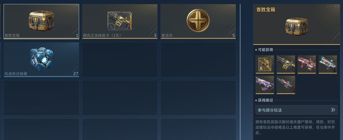 逆行者们通关猎场、塔防、时空追猎玩法中困难及以上难度时将消耗一次首胜奖励获得首胜宝箱,该宝箱最多存储7天,每天将自动补充一次奖励获取机会;开启该宝箱可以获得当前赛季的金色品质武器或武器碎片合成金色武器。