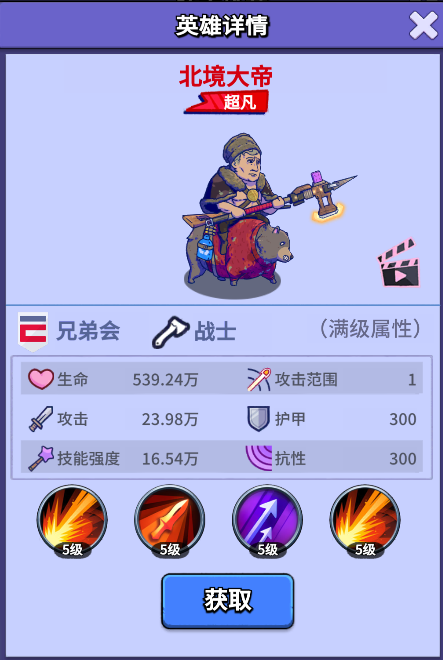 北境大帝作为超凡英雄,这意味着他的基础属性(生命、攻击、防御)比所有的传说卡还要高一个档次;其最大的优势在于能打到后排能眩晕还能给自己回血加盾加双防,是一个六边形战士,只能通过北境之王活动进行招募本体,对于氪佬或中氪玩家而言,是一个必须入手的超凡英雄。