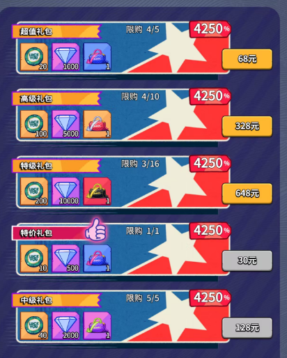 仅需要2个68就可以出来一个本体,一个648特惠礼包可以直达2星,三个648可以直达3星;