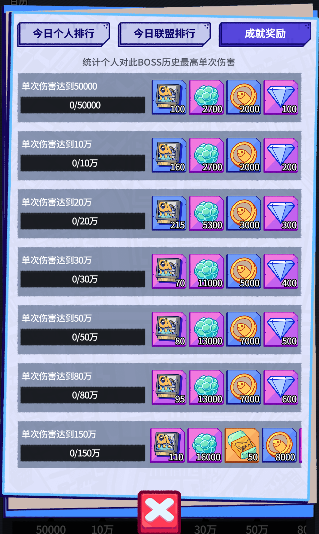 根据单次挑战对守卫造成的伤害,每达到一定目标值后,即可领取成就奖励。不同形态守卫的成就奖励独立统计。
