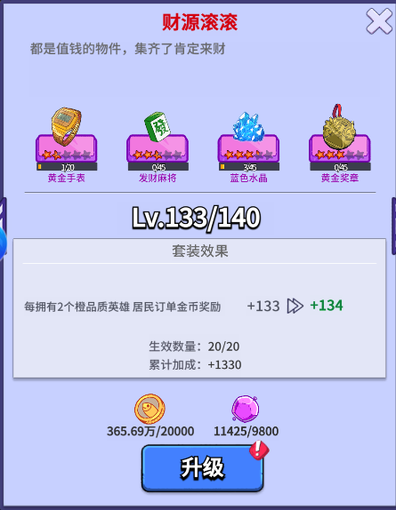 金币除了每日用钻石点金以外,还可以通过居民订单获取到大量金币,而居民订单的金币是可以提升的,比如紫色的藏品套装【财源滚滚】建议一直拉满等级,每天完成居民订单也能获得百万甚至几百万金币。