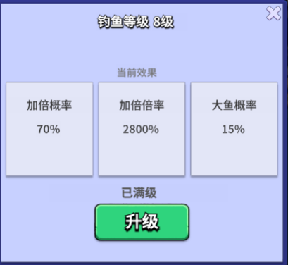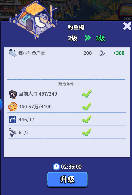 钓鱼椅主要产出基础资源【鱼】,并且收集图鉴还有奖励可以拿,而我们首先要做的就是升级钓鱼效果,满级为8级,加倍概率高达70%,加倍倍率有2800%,大鱼概率还有15%,钓鱼椅也是可以升级的,每级能自动增加每小时鱼的产量,但是不建议升级,因为每一次升级都会涉及到我们最稀缺的资源:蓝图,所有建筑升级都需要蓝图,但是前期蓝图是特别稀缺的,所以前期咱还是不建议升级钓鱼椅,中期以后看自己的蓝图情况,可以适当升级一下钓鱼椅,增加一下每小时的鱼产出也是可以的。