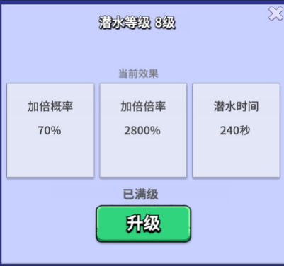 潜水船坞是一款向下潜水冒险的小游戏,可以获取到【废金属】【玻璃】【海藻】,同时还会偶尔触发遇到保险柜,通过日常活动获取的钥匙进行开箱,可以获得少量藏品碎片以及经验,潜水打捞的时间是有限制的,限制时间与潜水等级有关,最高单次潜水打捞为4分钟,点击自动,到时间会自动重新进入,这个设定其实是很不错的,一直到满基础资源以后,他就会浮在水面不动,大概隔一段时间就要去观察一下,不动了就可以进行其他活动。同样升级潜水等级至满级8级会带来加倍概率70%,加倍倍率2800%,潜水时间扩展到240秒,升级潜水船坞一样需要蓝图,不建议在紧缺的时候去升级船坞。