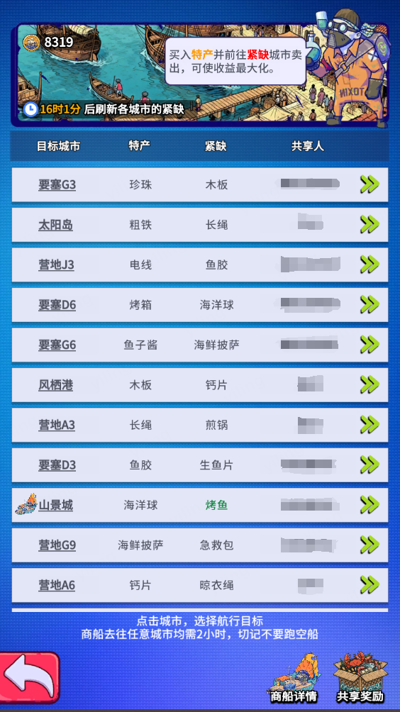 稀缺货物情报并非公开!每日需亲自探港才能获取,并可手动共享至联盟。一人探港,全盟受益——团结协作,才是称霸海洋的关键!
