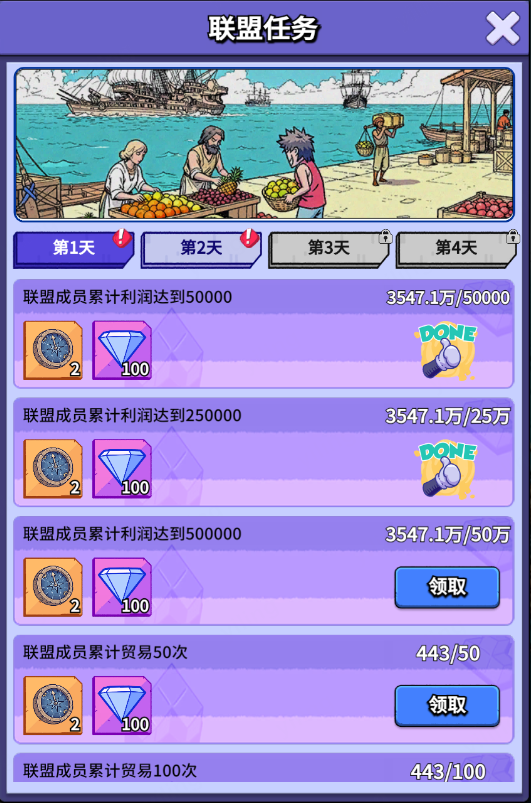 ≈ 联盟任务奖励:联盟成员累计利润达到一定目标可领取活动道具”商会指南“、海量钻石等。