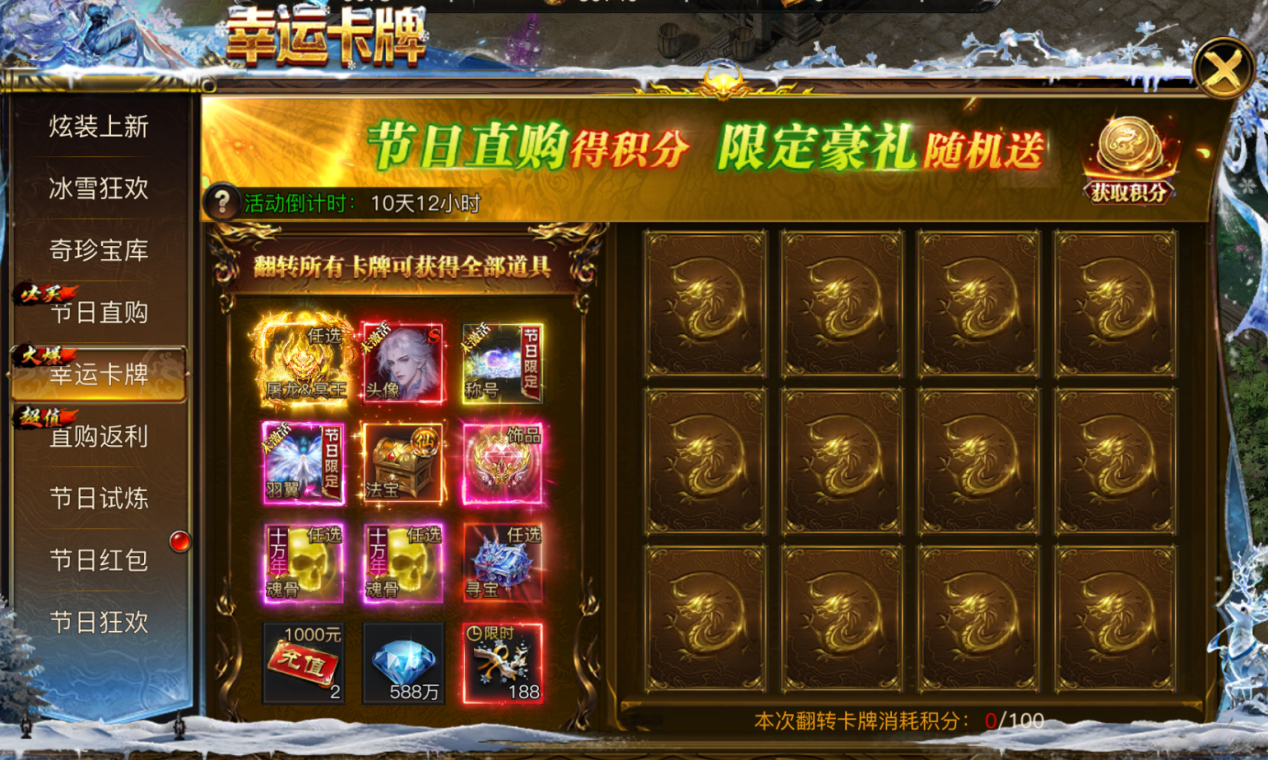 庆典期间每直购1元可获得1翻牌积分,完成翻牌可获得珍稀道具奖励,限定豪礼随机送,翻转所有卡牌可获得全部道具奖励!