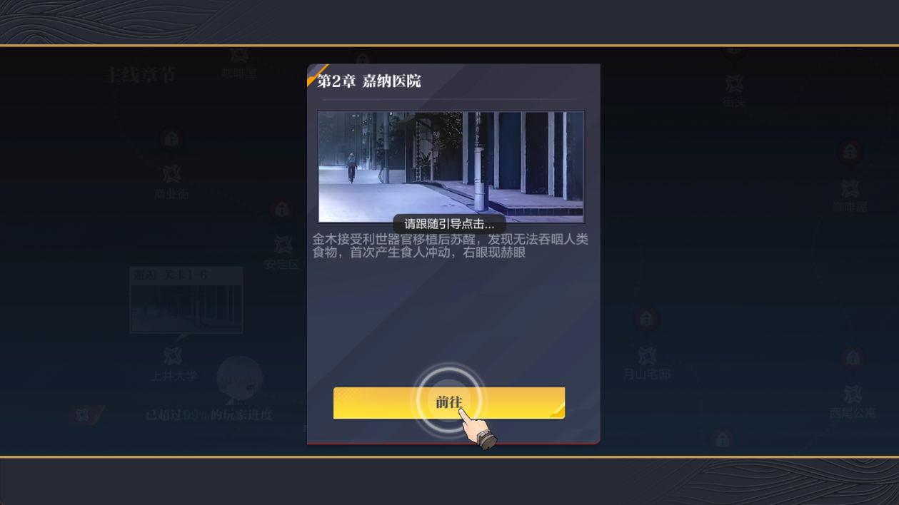 然而,非战斗场景的细节处理则显得中规中矩。主城界面采用2.5D俯视角设计,安定区咖啡馆、CCG总局等标志性建筑虽还原了原作设定,但贴图精度与动态元素较少,角色互动仅限于点击触发固定台词,缺乏一定的生动性和交互性。相比之下,隐藏彩蛋的设计更显用心——在CCG宿舍的书架上,玩家可翻到真户晓的笔记残页;月山家的宴会上,点击餐桌会触发“美食家”的经典台词,这些细节对原作粉丝而言堪称“情怀暴击”,能在不经意间唤起他们对原作的深刻记忆,增加游戏的趣味性和探索性。