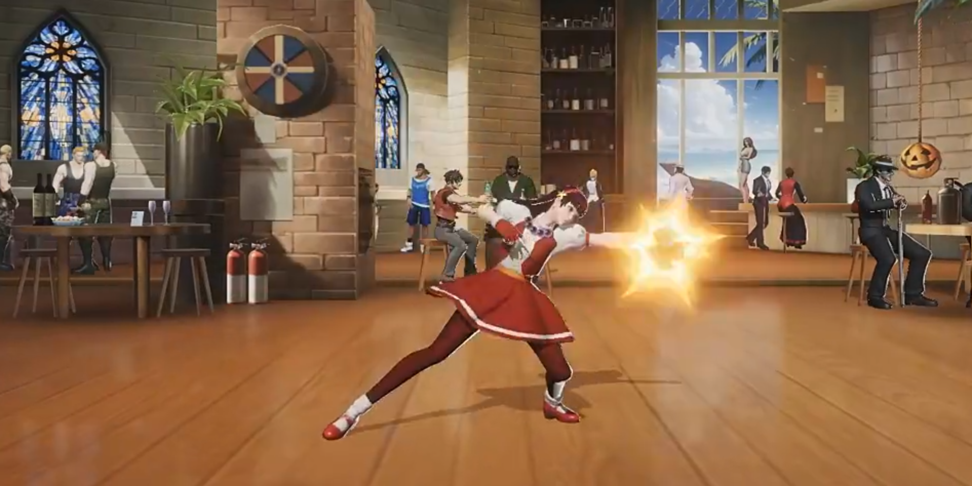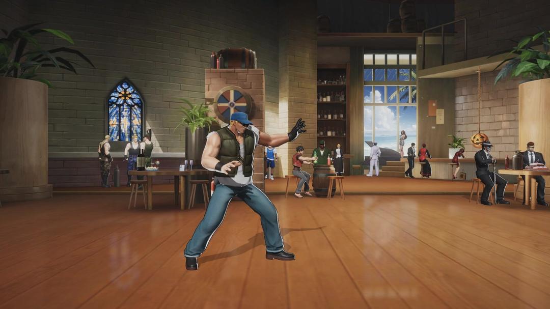 《全明星觉醒》在画面呈现上采用了“二次元风格+3D精细建模”的组合,既保留了SNK经典角色的标志性特征,又通过现代技术赋予其更生动的表现力。游戏中的角色模型细节丰富,从不知火舞的火焰扇舞到八神庵的苍炎特效,每一招一式都精准复刻了原作。以不知火舞为例,她的服装纹理清晰可见,扇子展开时的火焰特效层次分明,火焰流动的动态效果与角色动作完美同步,仿佛将玩家带回了《拳皇》系列的经典战场。战斗场景则采用了动态镜头,当角色释放必杀技时,镜头会跟随动作进行拉近、旋转或慢放,配合华丽的技能特效与震屏反馈,营造出堪比街机格斗的沉浸感。除了战斗场景,游戏中的“格斗之城”主城设计同样令人印象深刻。这一3D箱庭式开放区域并非简单的平面贴图,而是由多个功能场所(如幻影酒吧、竞技场、训练室)组成的立体空间。玩家可操控角色自由穿梭,与其他玩家实时互动,甚至触发隐藏彩蛋。这种细节设计不仅增强了探索趣味性,更让老玩家感受到满满的情怀共鸣。