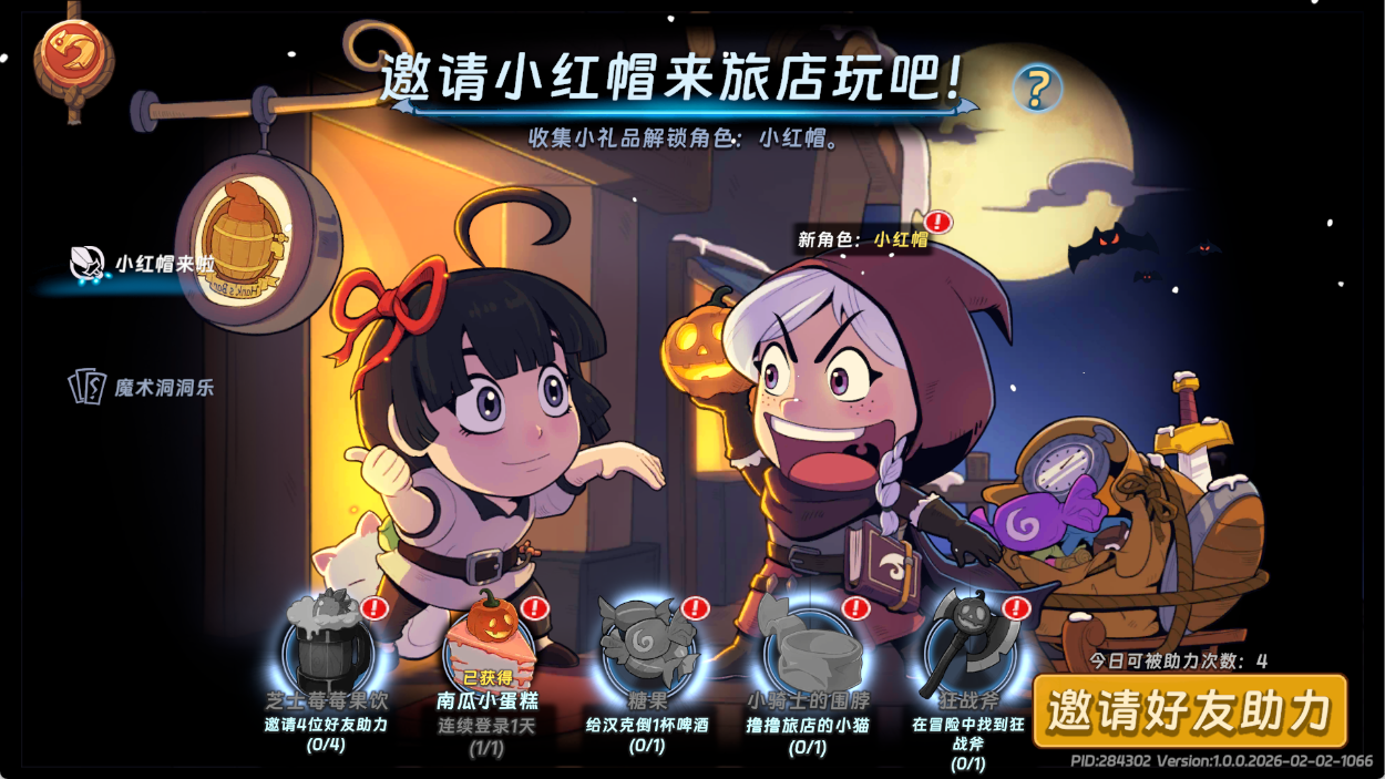 法术系统是游戏策略性的重要体现,每个角色自带一个不可替换的固有法术,确保核心机制稳定,其余法术需根据战场需求自由组合。所有法术均设有三个品质孔位,用于强化技能效果。玩家应围绕角色主属性路线进行法术筛选与升级,构建高协同度的技能链,从而在战斗中发挥出最大的威力。宝物系统则具有高度泛用性,每位角色可携带一件专属宝物上场,且已解锁的宝物可通过占卜系统跨角色装配。例如小斯诺的“保护娃娃零钱包”为稀有宝物,初始即赋予携带者100金币与两把钥匙的入场资源,该效果不绑定特定角色,适用于全阵容配置,是前期资源紧缺阶段的重要战术补充。除了核心玩法和养成内容,《汉克旅馆》还拥有许多特殊玩法,为玩家带来了创意十足的趣味体验。其中,与《月圆之夜》的联动活动堪称一大亮点。此次联动打破了IP边界,在魔法世界观与策略玩法层面实现了有机融合。联动核心角色小红帽以全新形态入驻汉克旅店世界,她可能以可操作角色、专属卡牌或限定道具等形式呈现。