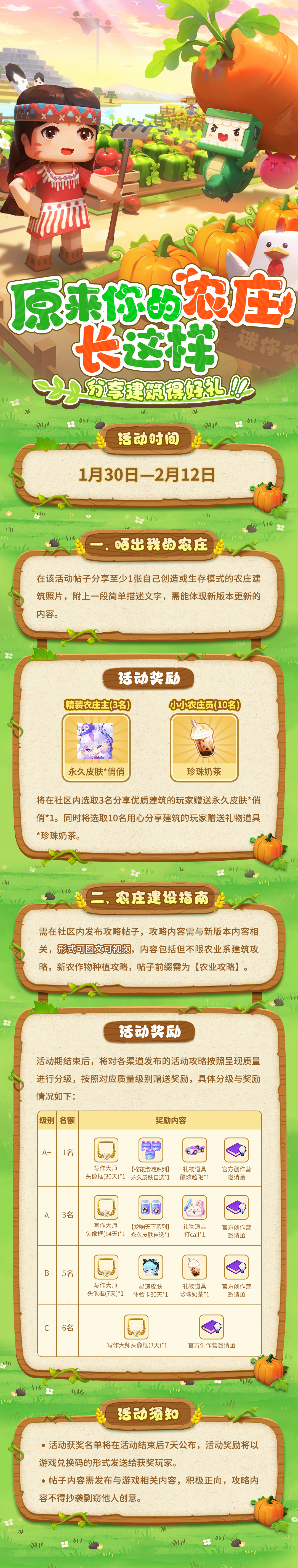 【攻略征集】:在社区内发布自己原创的【农业攻略】,不仅有机会获得永久皮肤与写作大师头像框,更有机会加入官方创作营,获得迷你币奖励哦!